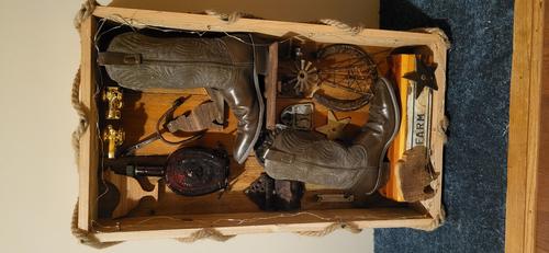 Wooden shadowbox wallhanging filled with ranch-themed bits, barbed wire, spurs, tractors, misc., highlighted by SAIC-graduated artist Goldie Schmiedeler's hand-cast resin cowboy boots, measures approx. 24" × 30" × 4", please contact for pricing
