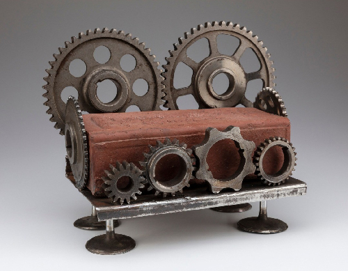 Lawrence, KS Benefit Auction piece, antique Lawrence, Kansas brick, wrapped in gears and cogs