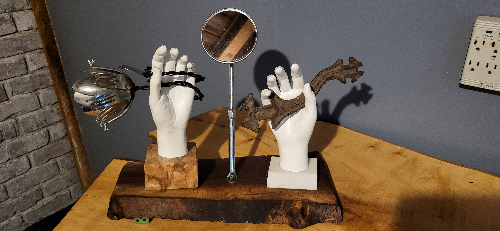Wood plank, mannequin hands, miscellaneous tools and welded art pieces, motorcycle mirror, Please contact for pricing measures about 16" × 16"